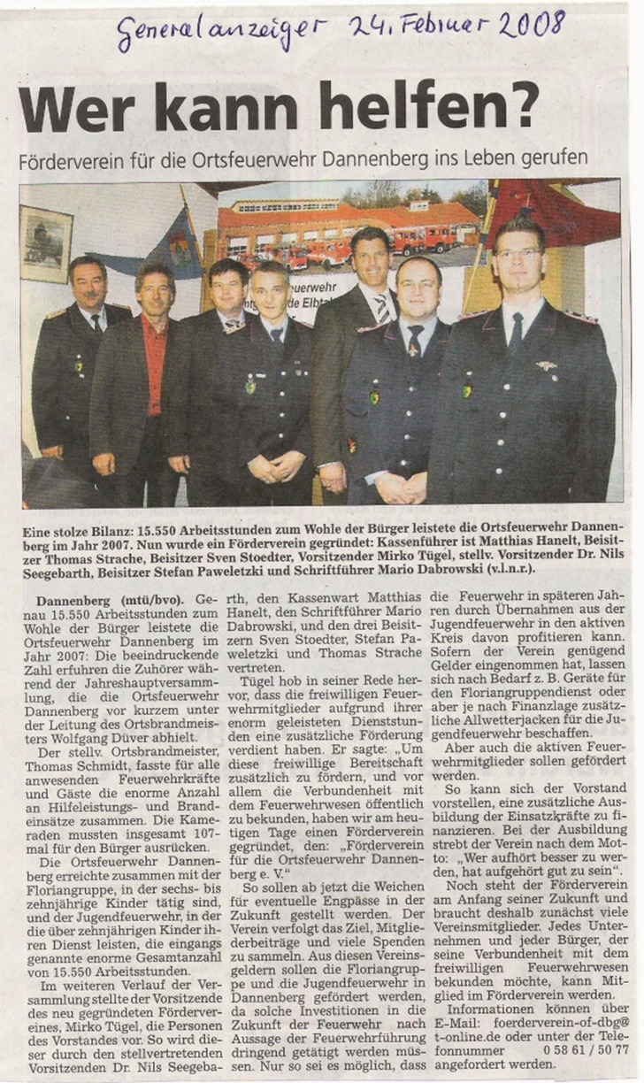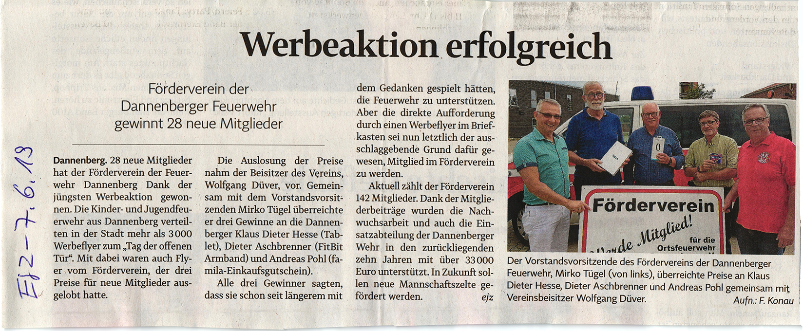 Klappern gehört zum Handwerk - diesem Motto waren wir im Förderverein für die Ortsfeuerwehr Dannenberg immer treu. Wir wollen nicht nur Gutes tun, sonder auch darüber berichten und so Mitmenschen von unserer Idee begeistern und sie zum mitmachen einzuladen. Nachfolgend findet ihr einen Auszug aus der öffentlichen Berichterstattung über unsere Arbeit.