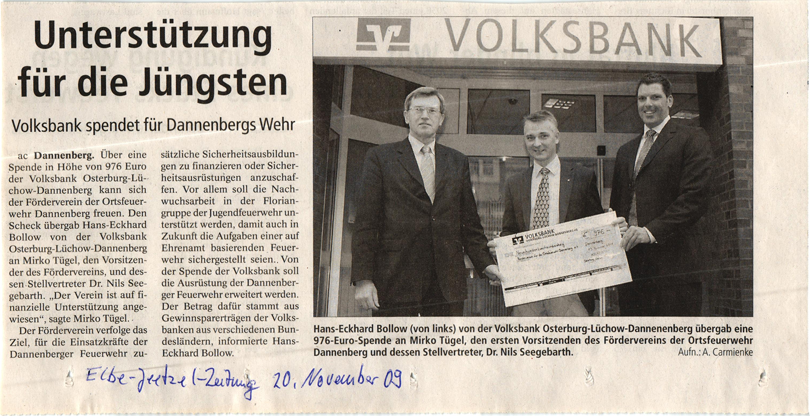 20.11.2009 - Elbe-Jeetzel-Zeitung über eine Spende der Volksbank