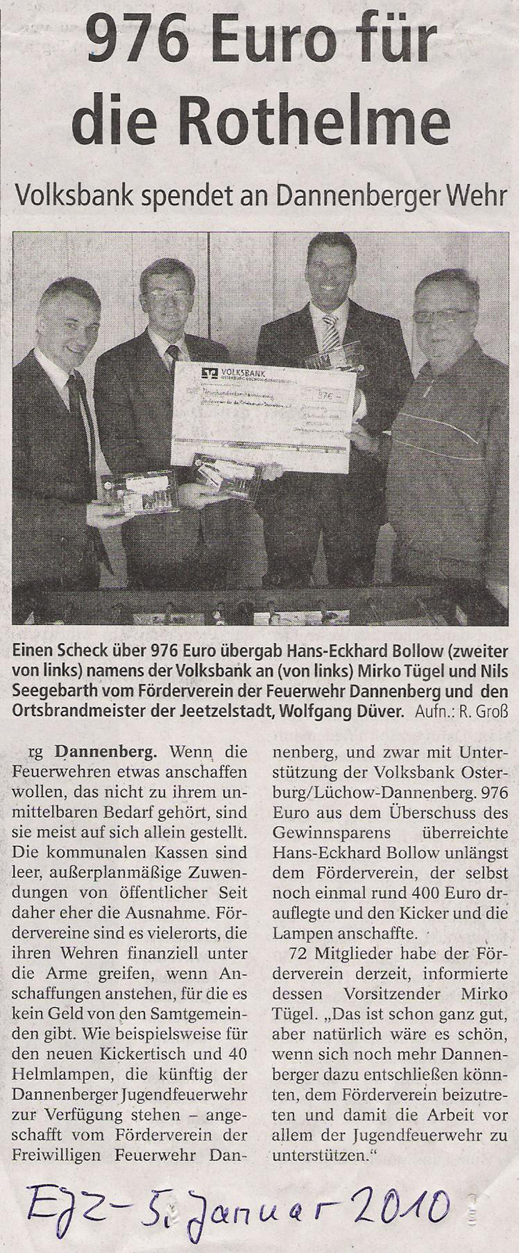 05.01.2010 - Elbe-Jeetzel-Zeitung über eine Spende der Volksbank