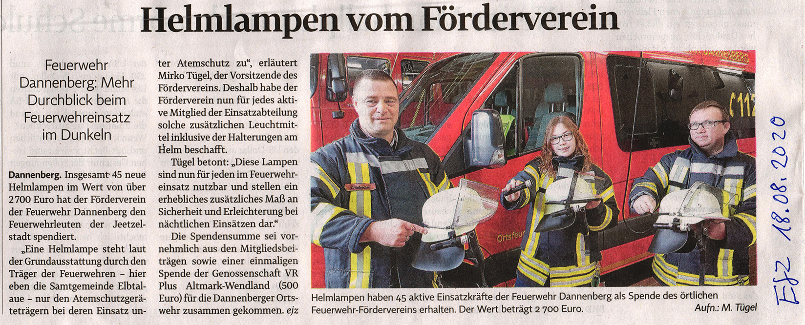 18.08.2020 - Elbe-Jeetzel-Zeitung über Helmlampen für die Einsatzabteilung