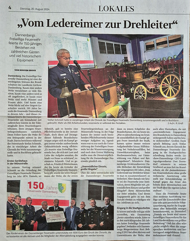 20.08.2024 - Elbe-Jeetzel-Zeitung über unsere Unterstützung zum Jubiläum der Feuerwehr