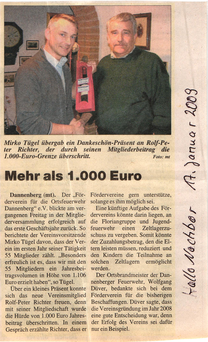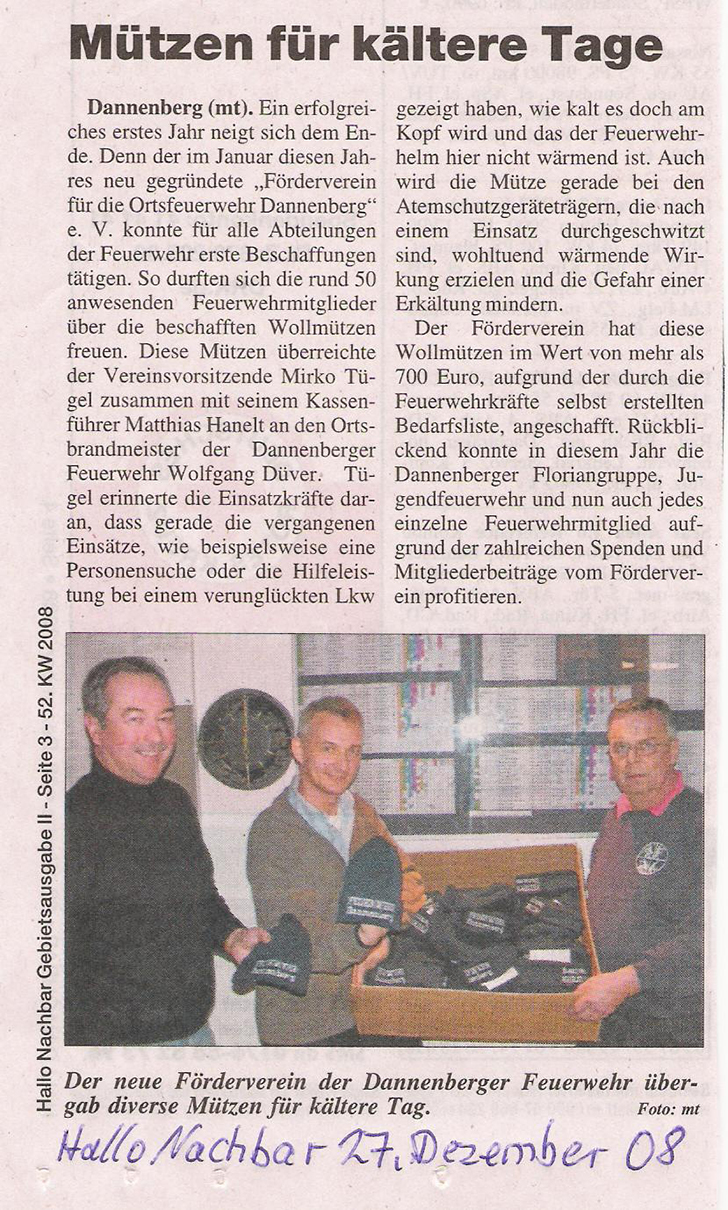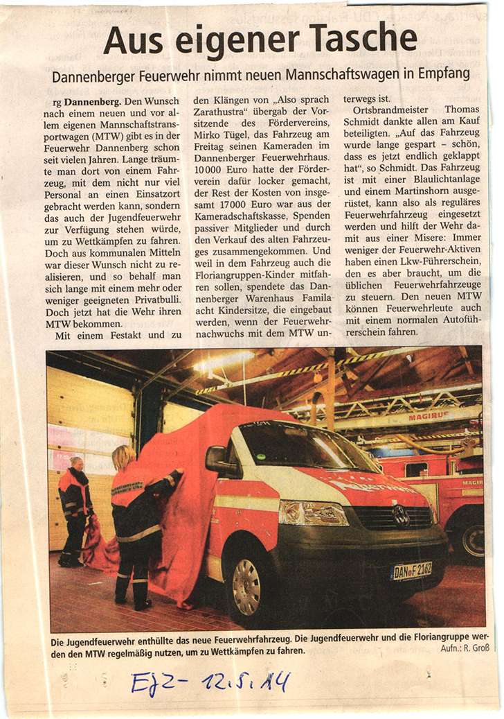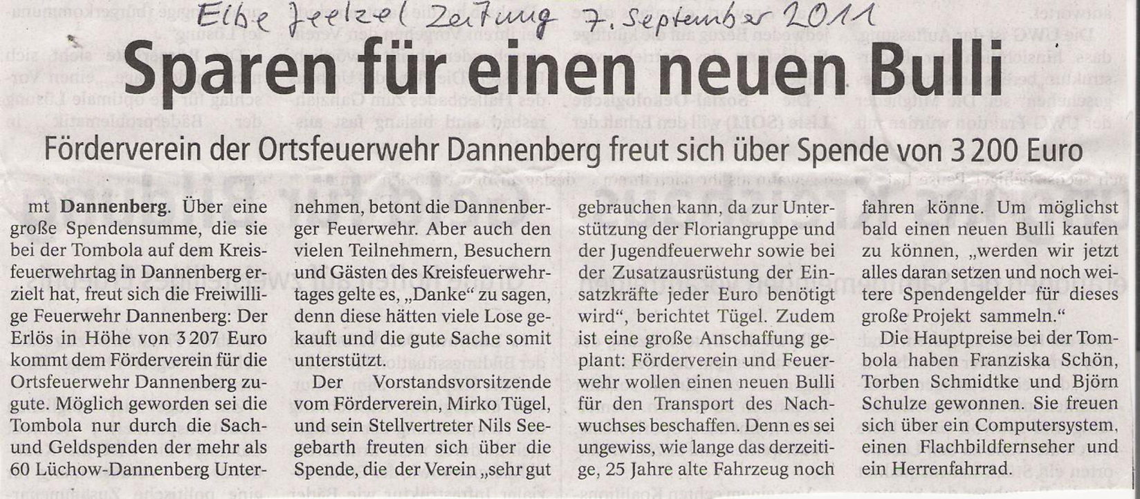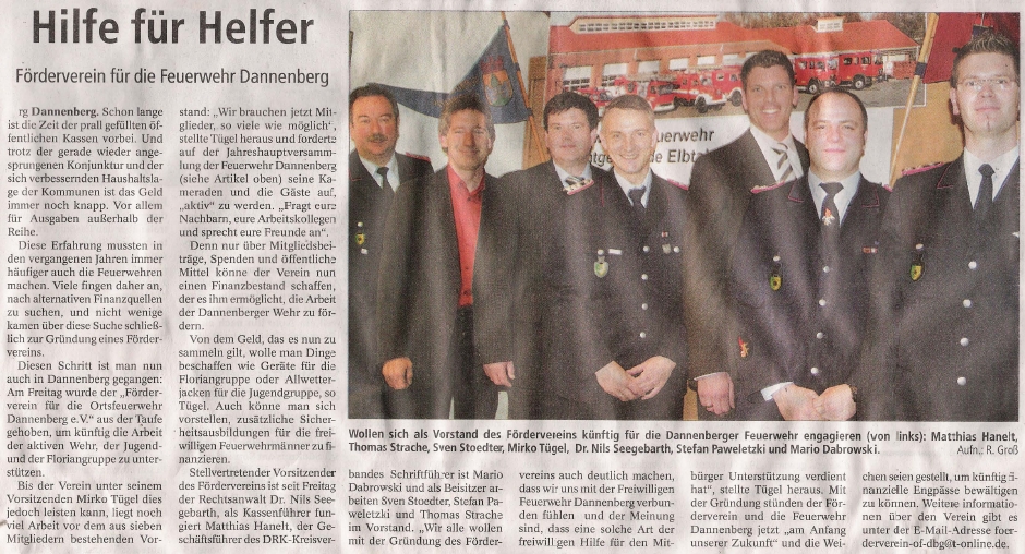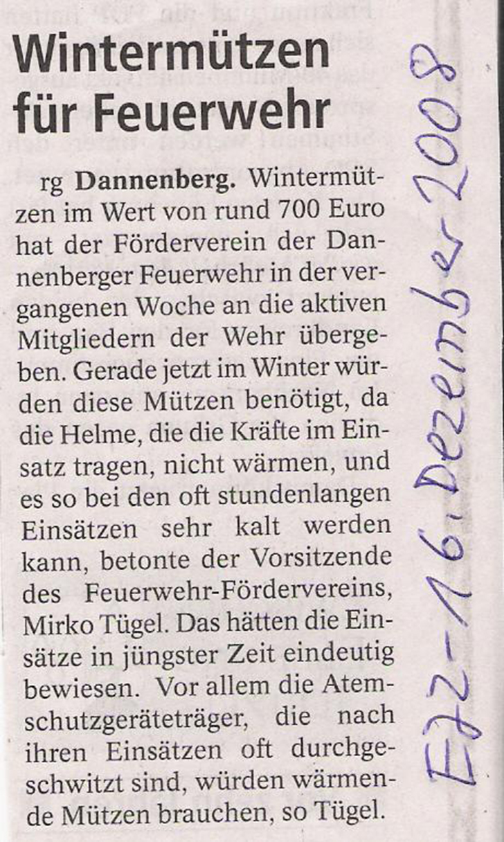 Klappern gehört zum Handwerk - diesem Motto waren wir im Förderverein für die Ortsfeuerwehr Dannenberg immer treu. Wir wollen nicht nur Gutes tun, sonder auch darüber berichten und so Mitmenschen von unserer Idee begeistern und sie zum mitmachen einzuladen. Nachfolgend findet ihr einen Auszug aus der öffentlichen Berichterstattung über unsere Arbeit.