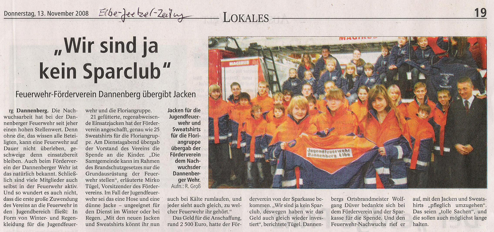 13.11.2008 - Elbe-Jeetzel-Zeitung über Parka für die Jugendfeuerwehr